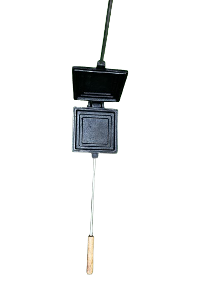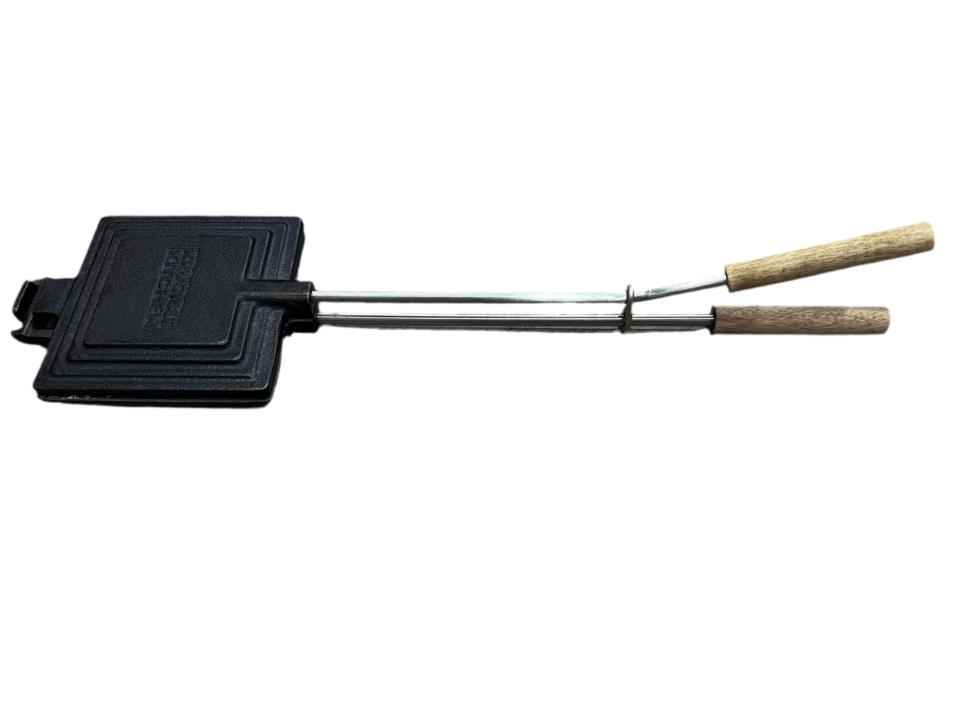 This cast iron Sandwich Maker / cooker features a two-part hinged design and a handle, making it perfect for cooking over an open flame or nestled between coals or over the Stove.